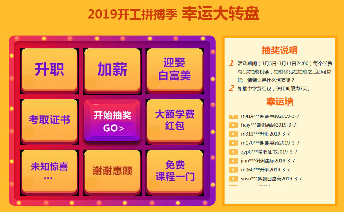 幸運大轉(zhuǎn)盤,轉(zhuǎn)出屬于你的2019關(guān)鍵詞,更有500元大額學(xué)費紅包等著你,想知道升職、加薪、迎娶白富美后面的學(xué)費是多少么,親自去試試手氣吧!每個學(xué)員賬號每天都有一次機會哦!如果一次不行,請明天換個姿勢再來一次!