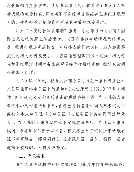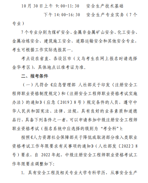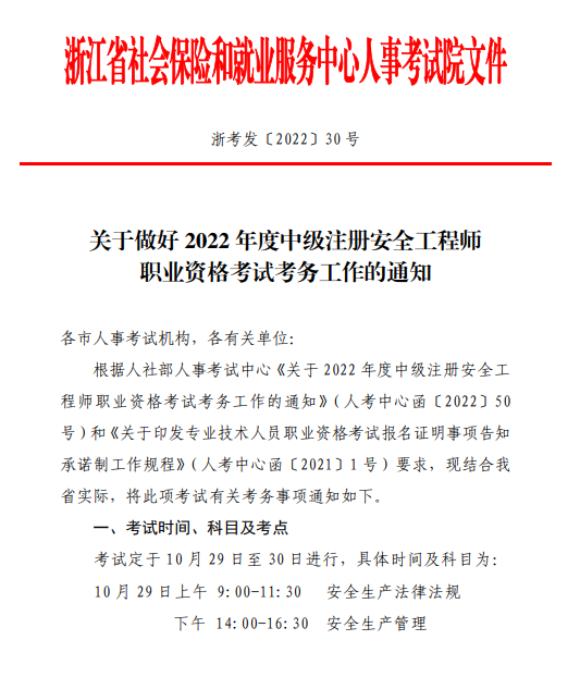 浙江關(guān)于做好2022年度中級(jí)注冊(cè)安全工程師職業(yè)資格考試考務(wù)工作的通知
