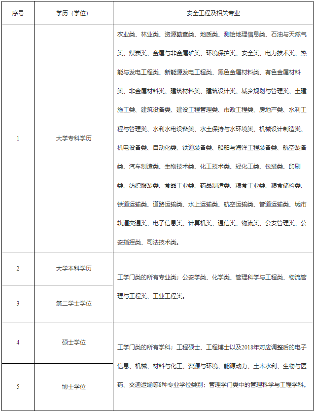 報(bào)名條件中“安全工程及相關(guān)專(zhuān)業(yè)”,按照《應(yīng)急管理部辦公廳關(guān)于印發(fā)<注冊(cè)安全工程師職業(yè)資格考試安全工程及相關(guān)專(zhuān)業(yè)參考目錄>的通知》(應(yīng)急廳函〔2019〕410號(hào))執(zhí)行,《注冊(cè)安全工程師職業(yè)資格考試安全工程及相關(guān)專(zhuān)業(yè)參考目錄》見(jiàn)附件2。