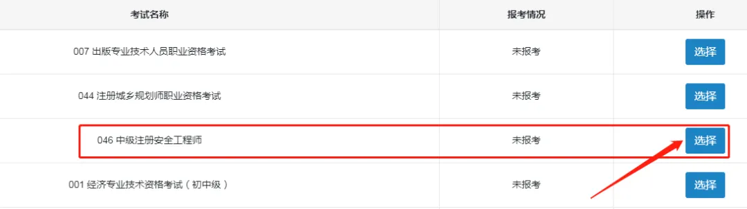 4、點擊左側(cè)導(dǎo)航菜單-進入考試報名,選擇考試項目"046 中級注冊安全工程師",填寫提交報名信息,資格審核通過后及時繳費,繳費成功即報名成功!