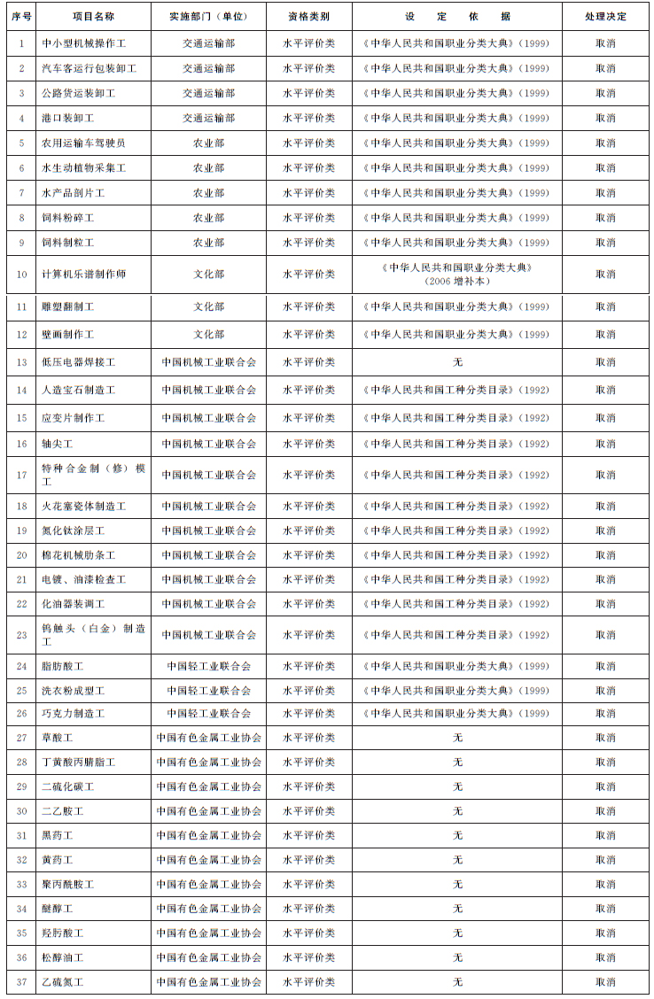 二、取消的技能人員職業(yè)資格許可和認(rèn)定事項(xiàng)(共計(jì)37項(xiàng),均為水平評(píng)價(jià)類(lèi))