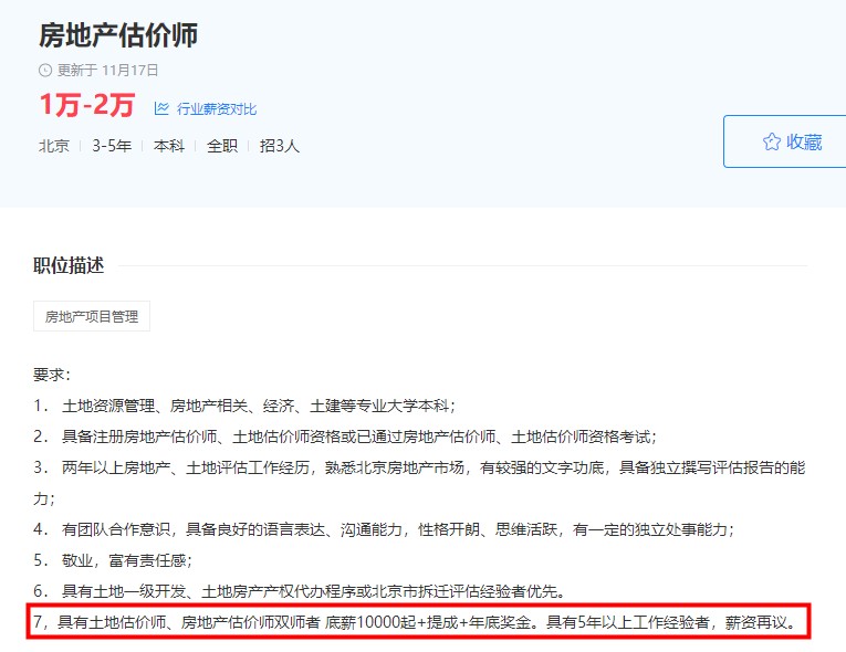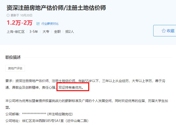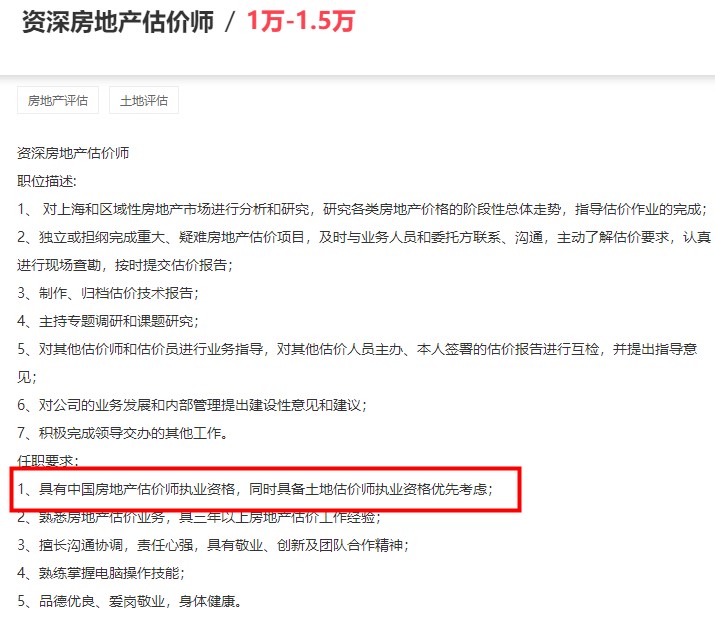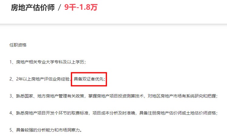 小編去某聯(lián)招聘中搜了一下工資較高的房地產(chǎn)估價(jià)師招聘要求,基本不約而同的要求具有房地產(chǎn)估價(jià)師證書或者土地估價(jià)師證書,其中很多公司說明持雙證者會(huì)優(yōu)先考慮,甚至有的公司對(duì)持雙證者會(huì)有額外的福利待遇。