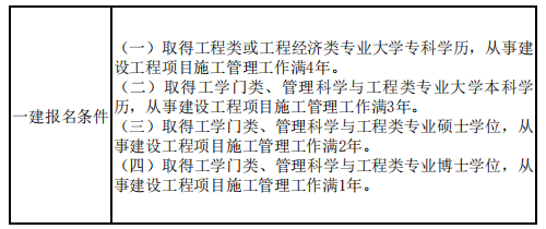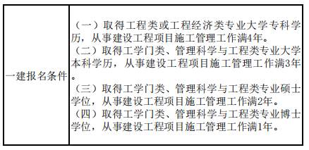 一建:大專需要工程類、工程經(jīng)濟類相關專業(yè)、并滿足建設工程項目施工管理的相應工作年限;本科及本科以上需要工學類、管理學類或者工程學類相關專業(yè),并滿足建設工程項目施工管理的相應工作年限。具體年限如下表所示: