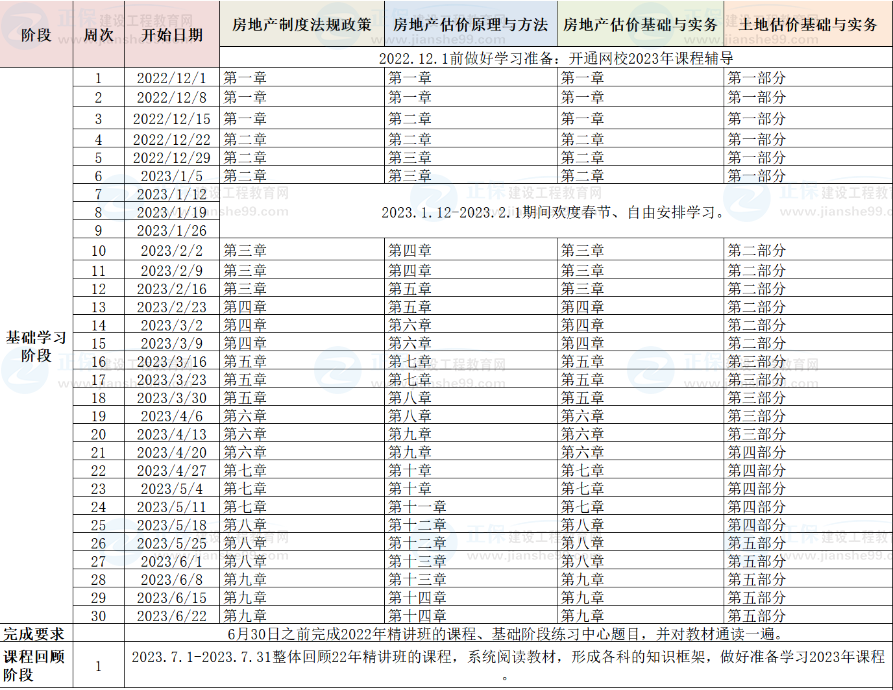 2、已報(bào)網(wǎng)校2023年房地產(chǎn)估價(jià)師輔導(dǎo)高效班/無憂班的同學(xué),將由班主任老師根據(jù)您的信息反饋及學(xué)習(xí)時(shí)間制定更詳盡的計(jì)劃表,如與本表不一致,請(qǐng)以班主任老師制定的學(xué)習(xí)計(jì)劃為準(zhǔn)。