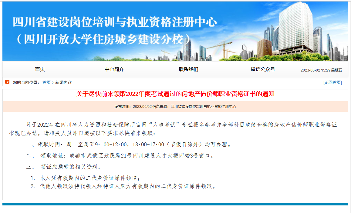 關(guān)于領(lǐng)取2022年度考試通過(guò)的四川房地產(chǎn)估價(jià)師職業(yè)資格證書(shū)的通知