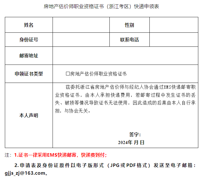 2、快遞申領(lǐng)方式:填寫《2023年房地產(chǎn)估價(jià)師職業(yè)資格證書快遞申請(qǐng)表》(詳見附件)并將申請(qǐng)表及身份證原件以電子版形式(JPG或PDF格式)發(fā)送至郵箱:gjjs_zj 163.com。