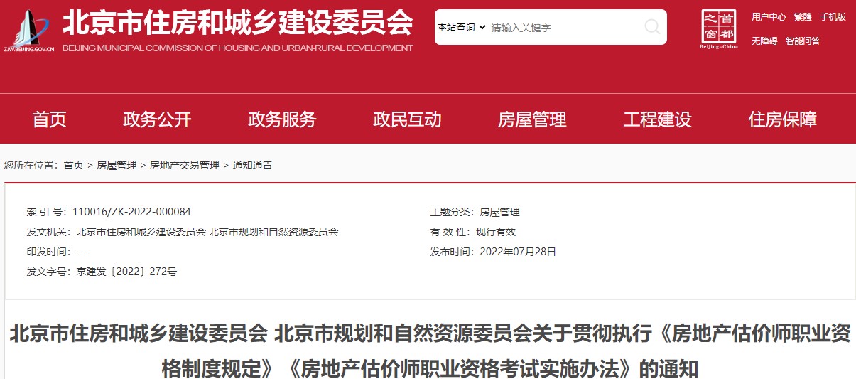 北京市住房和城鄉(xiāng)建設(shè)委員會 北京市規(guī)劃和自然資源委員會關(guān)于貫徹執(zhí)行《房地產(chǎn)估價師職業(yè)資格制度規(guī)定》《房地產(chǎn)估價師職業(yè)資格考試實施辦法》的通知