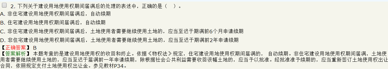 【解析】本題考查的是建設(shè)用地使用權(quán)出讓計劃、方式和年限。依據(jù)《物權(quán)法》規(guī)定,住宅建設(shè)用地使用權(quán)期間屆滿的,自動續(xù)期。參見教材P34.
