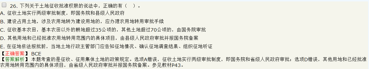 【解析】本題考查的是征收集體土地的政策規(guī)定。征收土地批準(zhǔn)權(quán)限的規(guī)定:(1)征收土地實(shí)行兩級(jí)審批制度,即由國(guó)務(wù)院和省級(jí)人民政府審批;(2)建設(shè)占用土地,涉及農(nóng)用地轉(zhuǎn)為建設(shè)用地的,應(yīng)辦理農(nóng)用地轉(zhuǎn)用審批手續(xù);(3)征收基本農(nóng)田,基本農(nóng)田以外的耕地超過(guò)35公頃的,其他土地超過(guò)70公頃的,由國(guó)務(wù)院審批;(4)其他用地和已經(jīng)批準(zhǔn)農(nóng)用地轉(zhuǎn)用范圍內(nèi)的具體項(xiàng)目,由省級(jí)人民政府審批并報(bào)國(guó)務(wù)院備案。參見(jiàn)教材P43.