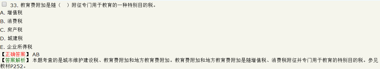 【解析】本題考查的是城市維護(hù)建設(shè)稅、教育費(fèi)附加和地方教育費(fèi)附加。教育費(fèi)附加和地方教育費(fèi)附加是隨增值稅、消費(fèi)稅附征并專門用于教育的特別目的稅,以各單位和個(gè)人實(shí)際繳納的增值稅、消費(fèi)稅的稅額為計(jì)征依據(jù),分別與增值稅、消費(fèi)稅同時(shí)繳納。參見教材P252。
