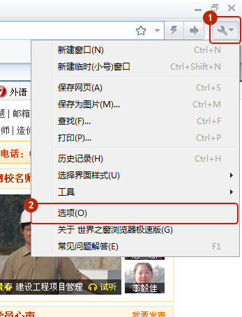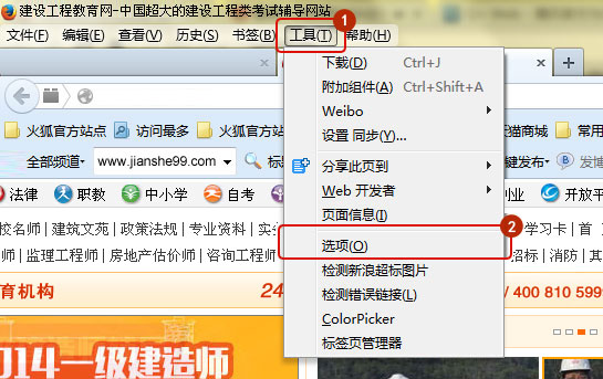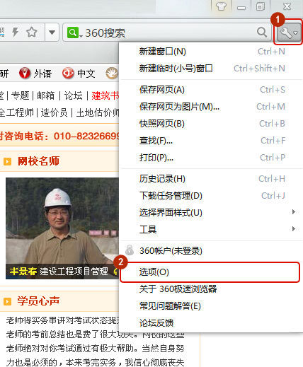 打開瀏覽器,先登錄到建設工程教育網(wǎng)的頁面(這步很重要),點擊右上角小扳手-選項,如圖所示: