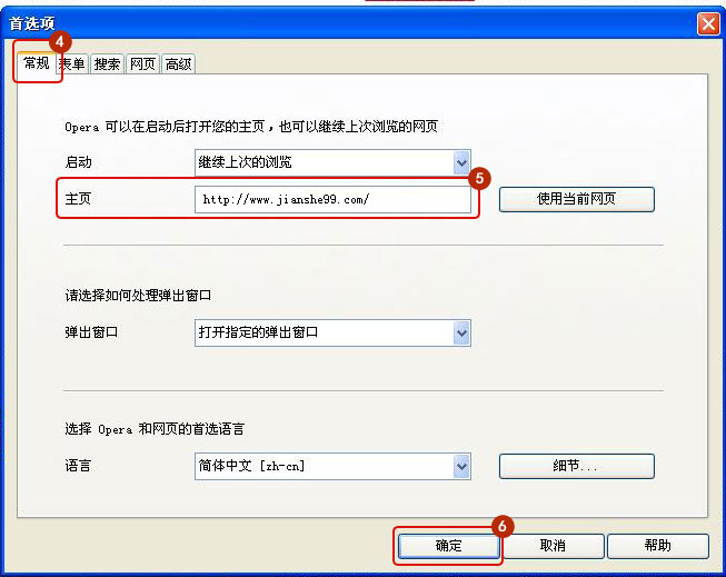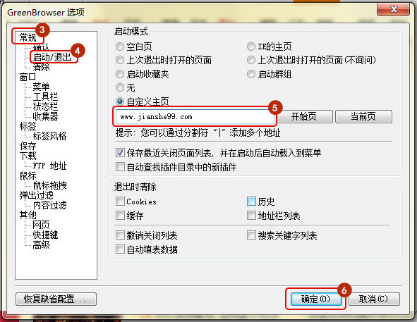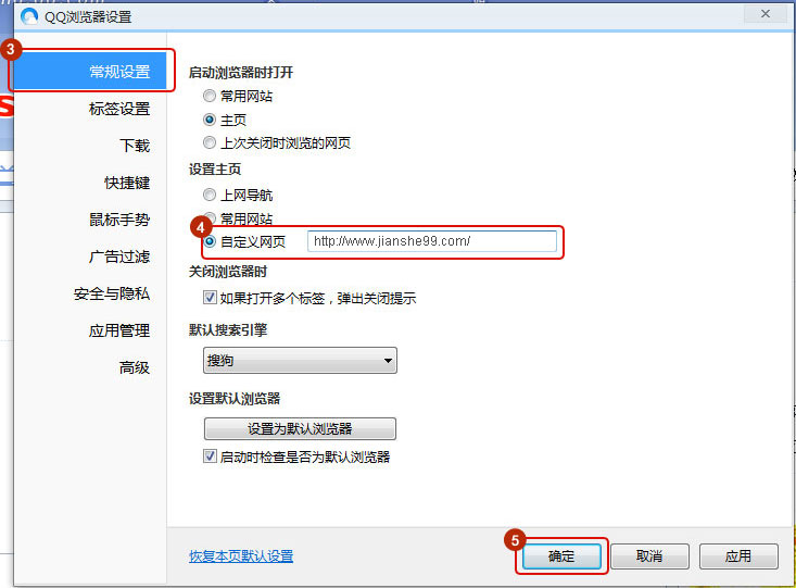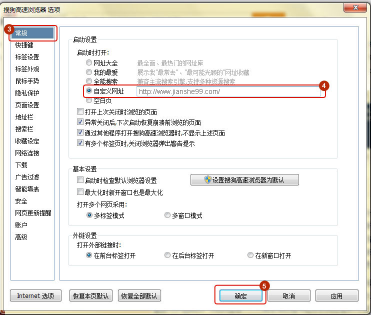 選擇常規(guī)設置選項,勾選自定義網(wǎng)址,并輸入www.wad158.com點擊保存,就設定建設工程教育網(wǎng)為主頁。