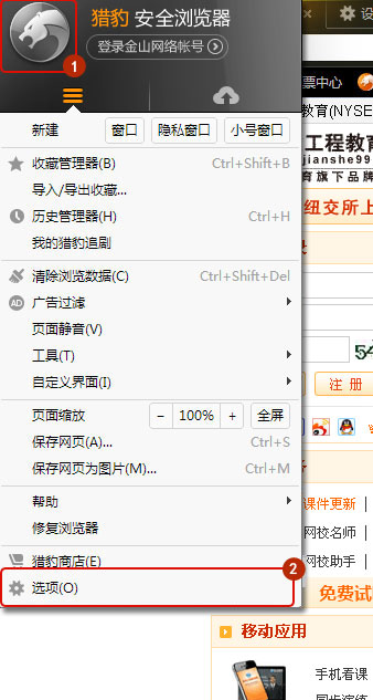 打開獵豹瀏覽器輸入并訪問 www.wad158.com后,點擊左上角豹頭>>選項。