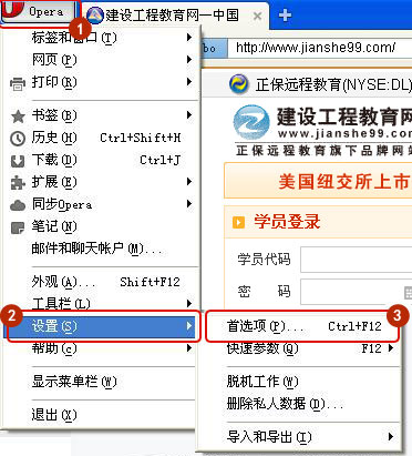 打開opera瀏覽器-左上角菜單-設置-首選項,如圖所示: