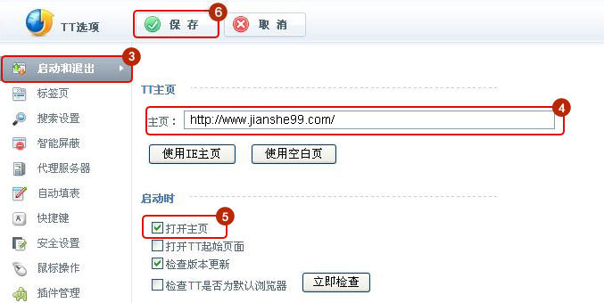 選擇啟動和退出,輸入www.wad158.com為主頁,勾選啟動時打開主頁。最后別忘了點擊保存按鈕。
