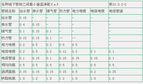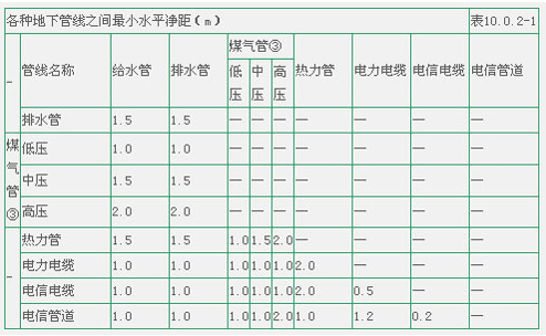 注: ①表中給水管與排水管之間的凈距適用于管徑小于或等于200mm,當(dāng)管徑大于200mm時(shí)應(yīng)大于或等于3.0m; ②大于或等于10kv的電力電纜與其它任何電力電纜之間應(yīng)大于或等于0.25m,如加套管,凈距可減至0.1m;小于10kv電力電纜之間應(yīng)大于或等于0.1m; ③低壓煤氣管的壓力為小于或等于0.005MPa,中壓為0.005~0.3MPa,高壓為0.3~0.8MPa.