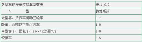 7) 停車場車位數(shù)的確定:本規(guī)范表6.0.5中機(jī)動(dòng)車停車位控制指標(biāo),是以小型汽車為標(biāo)準(zhǔn)當(dāng)量表示,其它各型車輛的停車位,應(yīng)按表11.0.2中相應(yīng)的換算系數(shù)折算。