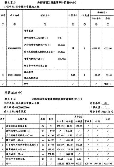 2.依據(jù)上述相關(guān)費用數(shù)據(jù)計算避雷裝置項目的工程量清單綜合單價,并分別填入答題紙表6.111.4“分部分項工程量清單綜合單價計算 表”和答題紙表6.11.3“分部分項工程量清單計價表”中的第6、7項。(計算結(jié)果均保留兩位小數(shù))。