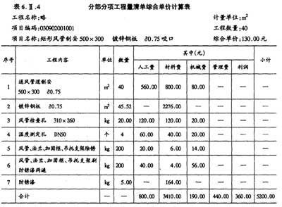 2.假設(shè)矩形風(fēng)管500×300的工程量為40m2時,依據(jù)《建設(shè)工程工程量清單計范》的規(guī)定,計算矩形風(fēng)管500× 300的工程量清單綜合單價,將相關(guān)數(shù)據(jù)內(nèi)容填入答表6.Ⅱ。4中,并在答題紙表6.Ⅱ.4下面列式計算所列項目的工程量或耗用量。