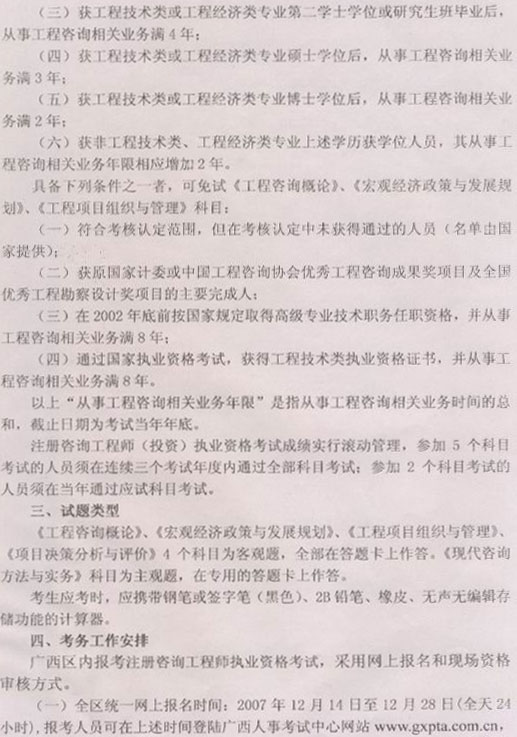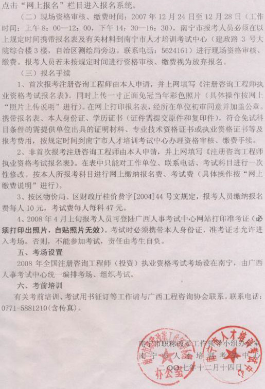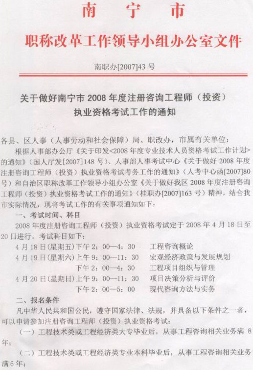 [南寧]2008年注冊咨詢工程師(投資)執(zhí)業(yè)資格考試07年12月14日至28日報名