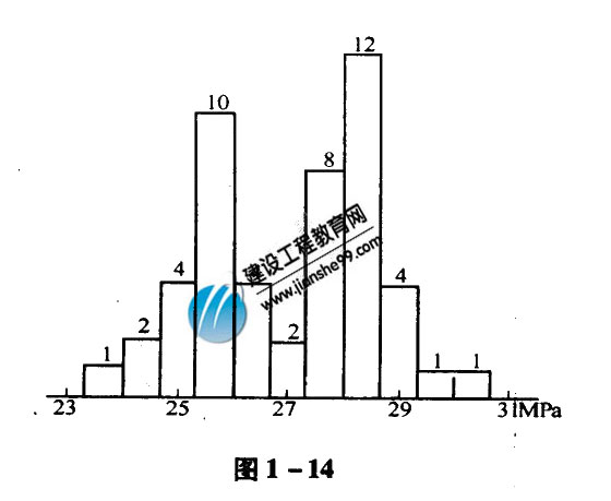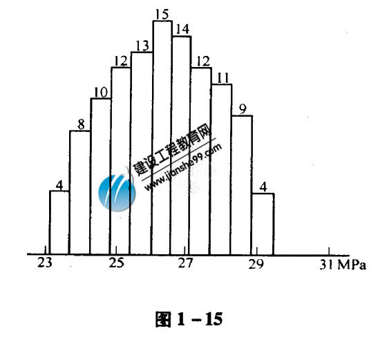10、【背景】某高速公路施工中,監(jiān)理工程師確認的混凝土試配強度為26.5MPa,已知Tu=31MPa;TL=23MPa,混凝土拌制工序的施工采用兩班制,監(jiān)理工程師收集了1個月的混凝土試塊強度資料,畫出直方圖如下,圖1-14為第五標(biāo)段的直方圖,圖1-15為第六標(biāo)段的直方圖,試對此二直方圖進行分析。