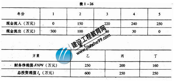 13、某建設(shè)工程項目,監(jiān)理單位參與了建設(shè)單位的前期投資決策。共有甲、乙、丙、丁4種方案可供考慮,計算工期均為5年,假定行業(yè)基準(zhǔn)收益率設(shè)定為ic=10%,其中甲方案中項目的現(xiàn)金流量如表1—26所示,其他乙、丙、丁3種方案的財務(wù)