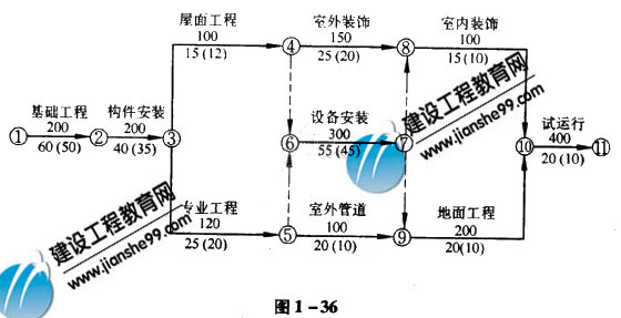 9、【背景】某單項工程按如圖1-36進度計劃正在進行施工。圖中箭線上方數(shù)字為工作縮短1天需增加的費用(元/天),箭線下括弧外數(shù)字為工作正常施工時間,箭線下括弧內(nèi)數(shù)字為工作最快施工時間。原計劃工期是220天,在第110天檢查時,工作2-3(構(gòu)件安裝)已全部完成,工作3-5(專業(yè)工程)剛剛開始施工,3-4按計劃進行。由于3-5是關(guān)鍵工作,所以它拖后10天,將導(dǎo)致工期延長10天完成。