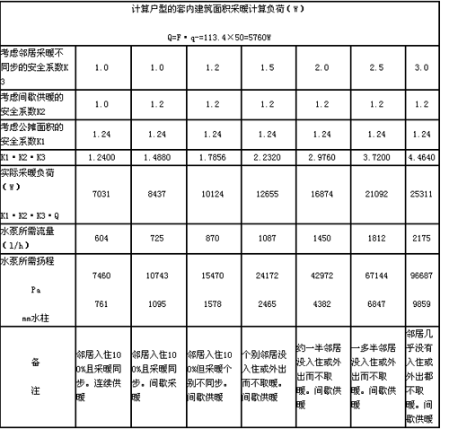 在式(3)中,L—水泵的計(jì)算流量,l/h;K1、K2、K3同式(2);△t—供回水平均溫差,℃,在此取△t=10;C—水的比熱,KJ/Kg·℃,其值為4.19;r—水的比重,Kg/l;其值為1;Q—計(jì)算戶型的采暖計(jì)算負(fù)荷,W,一般應(yīng)按采暖負(fù)荷計(jì)算方法得出結(jié)果,當(dāng)然也可用負(fù)荷指標(biāo)來估算: