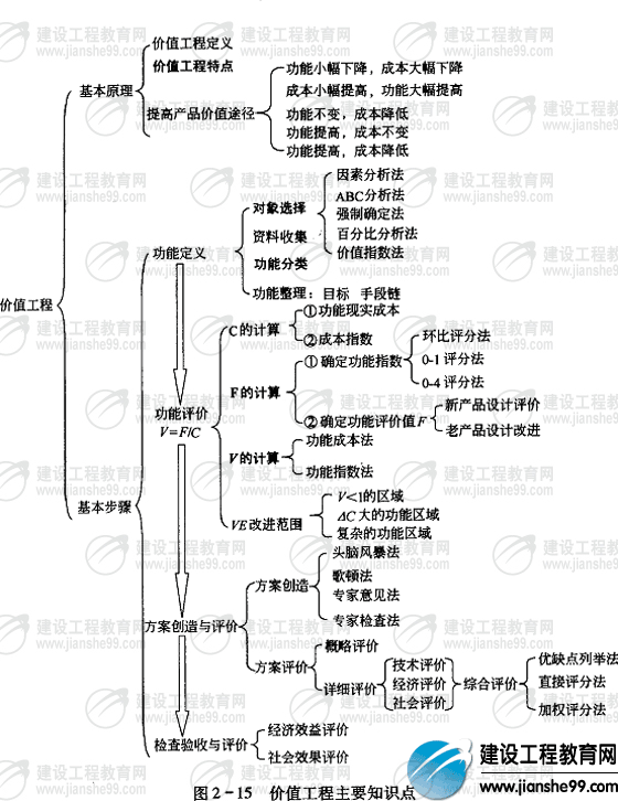 價值工程也是歷年考試的重點之一,價值工程的特點,尤其是前三個特點要注意理解,一般易出綜合題;提高產(chǎn)品價值的五個途徑雖然簡單,但是是實施價值工程的主要思路,與后面的價值分析聯(lián)系也比較緊密,因此要注意理解;對象選擇一方面要記住五種方法名稱,另一方面,對這五種方法的含義也要領(lǐng)會;價值工程以功能分析為核心,因此要了解功能有哪些類型,價值工程研究的是哪種功能;功能的計算包括打分方法和功能評價值的確定,也是考核的重點,可以通過練習(xí)掌握這部分內(nèi)容;價值計算比較簡單,關(guān)鍵是對計算結(jié)果的分析,經(jīng)常會出多選題,在此要結(jié)合提高價值的途徑理解這部分內(nèi)容。