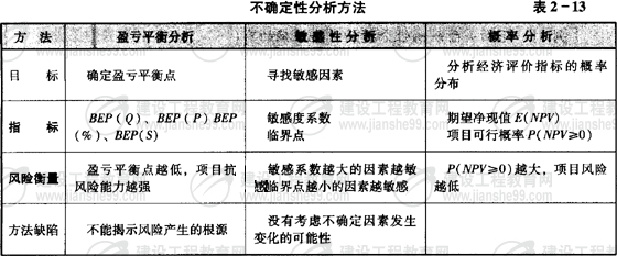 本節(jié)主要介紹了3種不確定性分析方法,每種方法都要求掌握指標(biāo)計算,熟悉風(fēng)險分析方法。其中盈虧平衡分析以指標(biāo)計算為主;敏感性分析要求根據(jù)指標(biāo)計算結(jié)果分析敏感因素;概率分析以指標(biāo)計算為主。