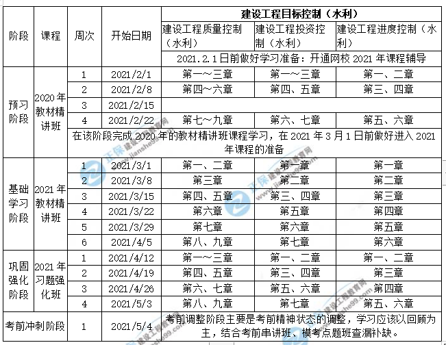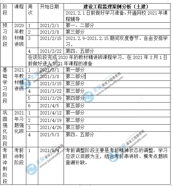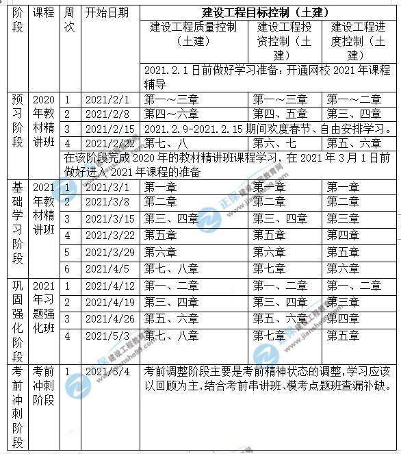 1、整體進(jìn)度說(shuō)明:本計(jì)劃表從2021年2月1日開(kāi)始執(zhí)行,計(jì)劃于2021年5月14日結(jié)束;其中:預(yù)習(xí)階段安排4周,基礎(chǔ)學(xué)習(xí)階段安排6周,鞏固強(qiáng)化階段安排4周,5月為考前沖刺階段。學(xué)員可根據(jù)本表的提示,結(jié)合自己的工作、學(xué)習(xí)情況進(jìn)行細(xì)化,并按網(wǎng)校要求完成聽(tīng)課、做題的學(xué)習(xí)任務(wù),基本可滿足考試需要。