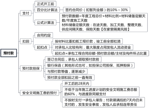 1.工程預(yù)付款是由發(fā)包人按照合同約定,在正式開工前由發(fā)包人預(yù)先支付給承包人,用于購(gòu)買工程施工所需的材料和組織施工機(jī)械和人員進(jìn)場(chǎng)的價(jià)款。