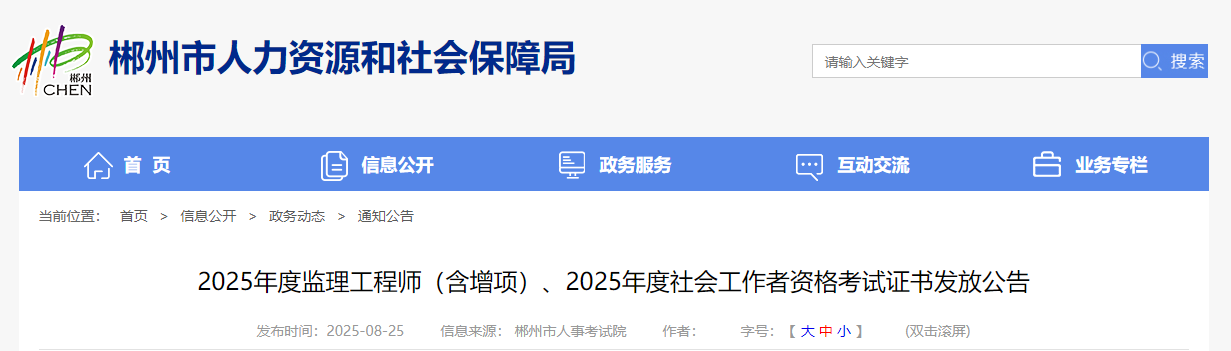 2025年度監(jiān)理工程師(含增項(xiàng))、2025年度社會(huì)工作者資格考試證書(shū)發(fā)放公告
