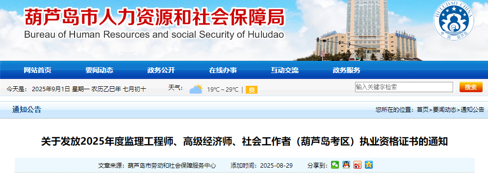 關(guān)于發(fā)放2025年度監(jiān)理工程師、高級經(jīng)濟師、社會工作者(葫蘆島考區(qū))執(zhí)業(yè)資格證書的通知