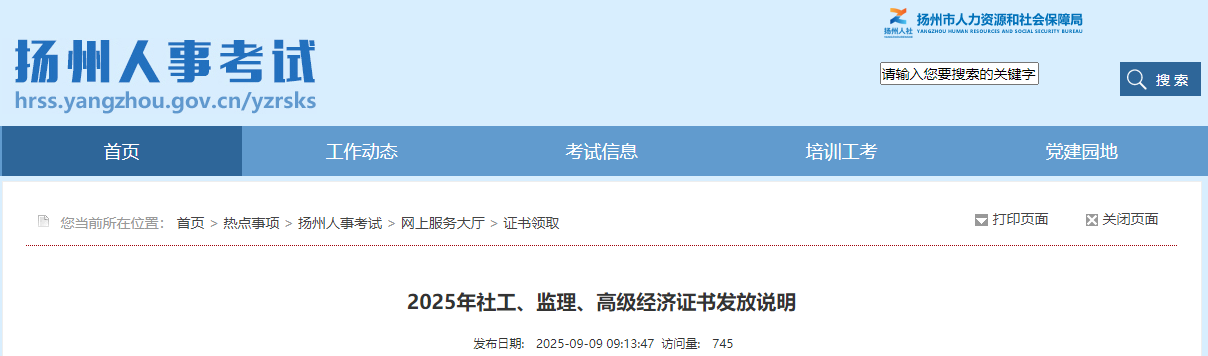 2025年社會工作者、監(jiān)理工程師、高級經(jīng)濟(jì)師證書已到??忌傻卿浗K省人事考試網(wǎng)上業(yè)務(wù)辦理平臺(jiangsu.nomax.vip/bas)申請到付郵寄,現(xiàn)場發(fā)放地址邗江中路98號(市考試中心位于揚州市工業(yè)職業(yè)技術(shù)學(xué)院內(nèi)華揚樓東側(cè)一樓服務(wù)大廳,請配合學(xué)校保衛(wèi)進(jìn)行登記,證書憑考生身份證原件領(lǐng)取)。