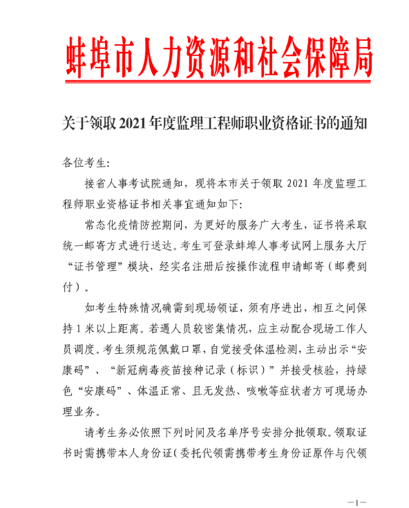 關于領取2021年度蚌埠監(jiān)理工程師職業(yè)資格證書的通知