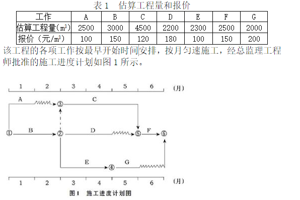 某工程,建設(shè)單位與施工單位按照《建設(shè)工程施工合同(示范文本)》簽訂了施工承包合同。 合同約定:工期6個(gè)月;A、B工作所用的材料由建設(shè)單位采購(gòu);施工期間若遇物價(jià)上漲,只對(duì)鋼材、水泥和骨料的價(jià)格進(jìn)行調(diào)整,調(diào)整依據(jù)為工程造價(jià)管理部門(mén)公布的材料價(jià)格指數(shù)。招標(biāo)文件中工程量清單所列各項(xiàng)工作的估算工程量和施工單位的報(bào)價(jià)如表1所示。