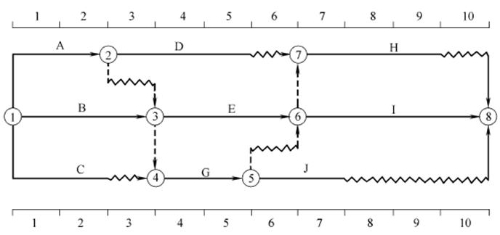 【答案解析】 本題考查的是時(shí)標(biāo)網(wǎng)絡(luò)計(jì)劃中時(shí)間參數(shù)的判定。工作的總時(shí)差:(1)以終點(diǎn)節(jié)點(diǎn)為完成節(jié)點(diǎn)的工作,其總時(shí)差應(yīng)等于計(jì)劃工期與本工作最早完成時(shí)間之差;(2)其他工作的總時(shí)差等于其緊后工作的總時(shí)差加本工作與該緊后工作之間的時(shí)間間隔所得之和的最小值。據(jù)此計(jì)算,工作I的總時(shí)差為0,工作H的總時(shí)差為1,工作J的總時(shí)差為3,工作G的總時(shí)差為min{0+1,1+1,3+1}=1,則工作C的總時(shí)差為min{1+1}=2。