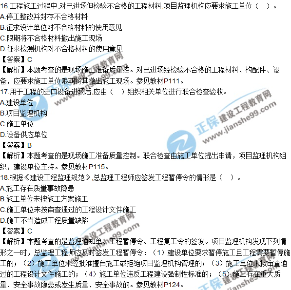 2018年監(jiān)理工程師考試于5月19日、20日舉行,考試過后,廣大考生最關(guān)心的問題莫過于“2018年監(jiān)理工程師《建設(shè)工程質(zhì)量、投資、進度控制》試題及答案”了,建設(shè)工程教育網(wǎng)將會根據(jù)學員反饋,及時匯總2018監(jiān)理試題相關(guān)信息分享給大家,并且會及時做出答案解析,希望能為廣大監(jiān)理考生朋友帶來幫助。
