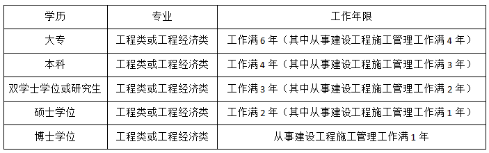 2、有工程類或工程經(jīng)濟(jì)類大專以上學(xué)歷并從事建設(shè)工程項目施工管理工作滿20年。