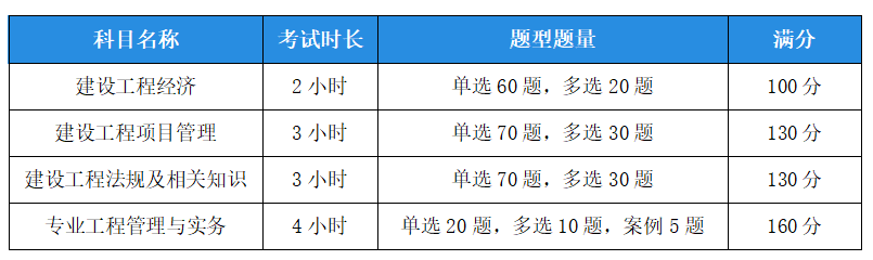 公共科目為《建設(shè)工程經(jīng)濟(jì)》、《建設(shè)工程項目管理》、《建設(shè)工程法規(guī)及相關(guān)知識》,試題的題型分為單項選擇題和多項選擇題;專業(yè)科目為《專業(yè)工程管理與實務(wù)》,試題的題型分為單項選擇題、多項選擇題、案例分析題。