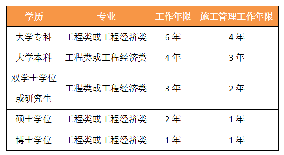 2、有工程類或工程經(jīng)濟(jì)類大專以上學(xué)歷并從事建設(shè)工程項(xiàng)目施工管理工作滿20年。