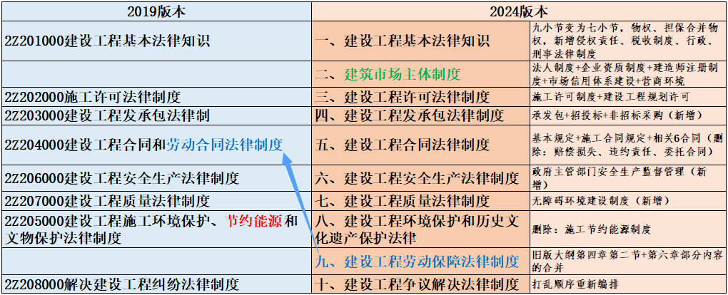 舊版大綱原為八章36節(jié)內(nèi)容,24年大綱改為十章44節(jié)內(nèi)容。24版大綱章節(jié)內(nèi)容框架進行了整合梳理并重新分配章節(jié),整體內(nèi)容都有所變動。具體變化詳見表格: