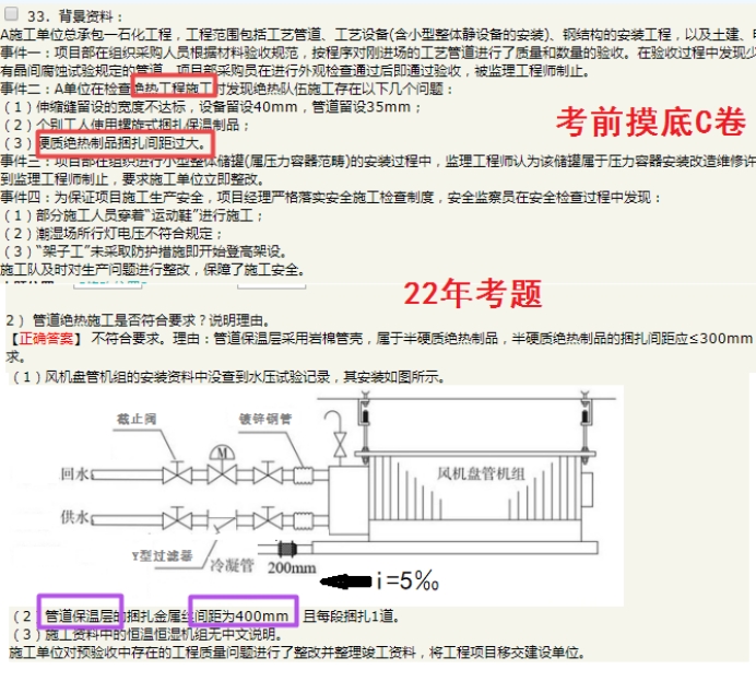 此次考試總體講:客觀題中規(guī)中矩,都是老師反復(fù)強(qiáng)調(diào)的知識點(diǎn)。主觀題實(shí)操性越來越強(qiáng),圖文結(jié)合,考查考生將問題與教材理論接軌的能力。比如配電柜柜體的間隙要求?冷凝管的坡度要求——作為數(shù)字類的識圖挑錯題出現(xiàn);還有簡答型識圖題——自動扶梯的組成等。關(guān)于風(fēng)機(jī)盤管的安裝技術(shù)要求,半小問超出教材考查規(guī)范內(nèi)容,但對總體通過考試影響不大。