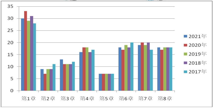 今年考試比較常規(guī),和往年相比,難度不大,大部分都是教材原文知識(shí)點(diǎn),也沒(méi)有那些彎彎繞繞。就今年的考情分析,各章節(jié)分值基本沒(méi)有太大變化,考點(diǎn)分布較綜合,大多數(shù)考生反映《法規(guī)》試題相對(duì)簡(jiǎn)單,下面就讓我們看一下近五年試題分值的分布情況: