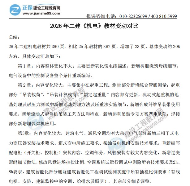 2026年一級(jí)建造師《機(jī)電工程》新教材變動(dòng)對(duì)比來(lái)嘍!建設(shè)工程教育網(wǎng)教務(wù)團(tuán)隊(duì)拿到教材后第一時(shí)間為大家梳理變動(dòng)詳細(xì)內(nèi)容,經(jīng)核對(duì),2026年機(jī)電工程科目整體變動(dòng)約25%,教材變動(dòng)內(nèi)容如下,更多變動(dòng)解讀請(qǐng)關(guān)注1月7日20:00康仁杰老師直播間!直播入口>>