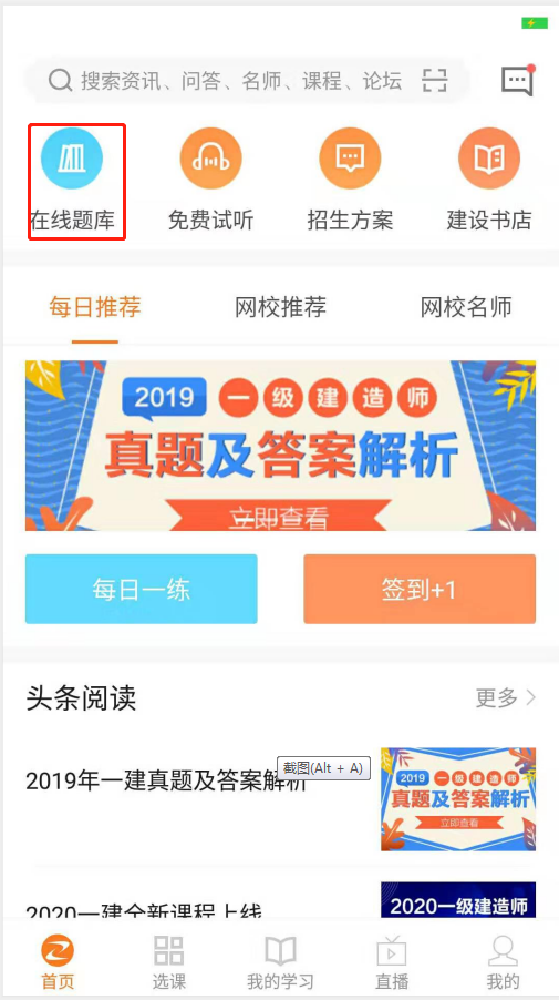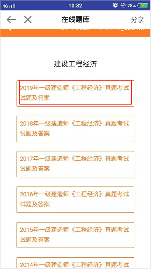 第一步:打開建設工程師教育網(wǎng)APP,點擊在線題庫。第二步:點擊歷年試題。第三步:點擊一級建造師-工程經(jīng)濟。第四步:選擇2019年一級建造師工程經(jīng)濟科目進行估分。