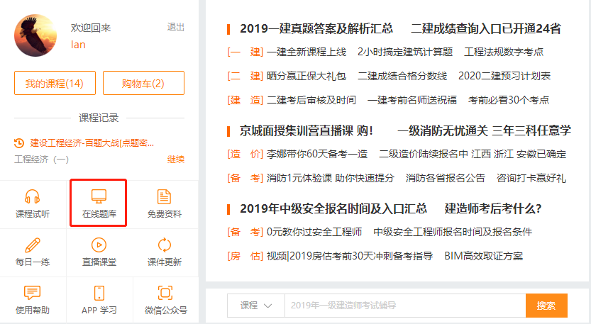第一步:打開建設工程師教育網(wǎng),點擊在線題庫。