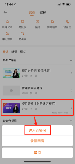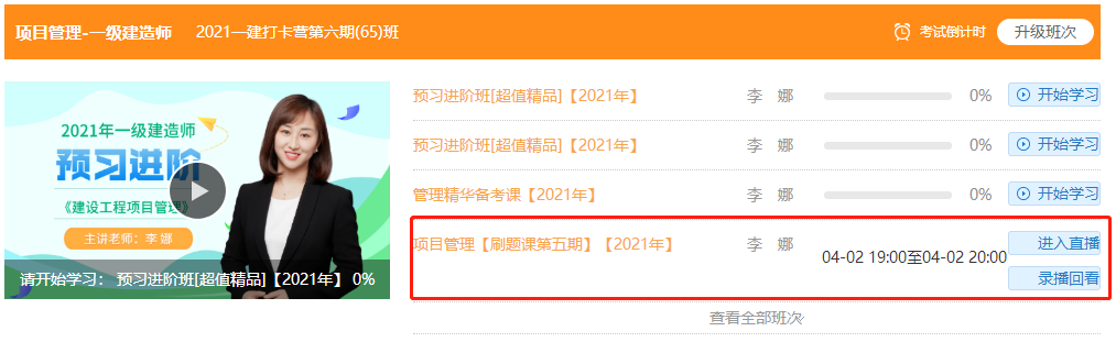 點擊我的課程—項目管理—項目管理[刷題課第五期]2021—點右側(cè)進入直播—進入后即可觀看直播!