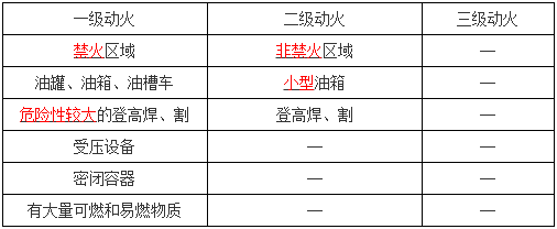 表格的內(nèi)容,記住二級動(dòng)火即可,三級動(dòng)火的情況是無法描述的,所以考試案例背景中無法敘述,那么只要案例題目出現(xiàn)動(dòng)火的內(nèi)容,只要不是二級的,就是一級的,非此即彼。